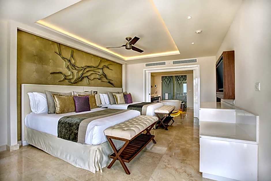 Luxury Junior Suite swim out Diamond Club (1 King Bed and 1 Double Sofa Bed) includes a king-size bed 150-183 width plus a sofa bed plus balcony, desk, satellite tv , cable tv, hairdryer, tea and coffee making facilities , ironing set, and safe and is Wheelchair-accessible.